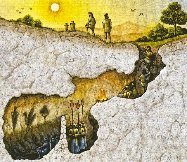 Plato's Allegory of the Cave describes a group of people who have lived chained to the wall of a cave all of their lives, facing a blank wall. The people watch shadows projected on the wall from objects passing in front of a fire behind them and begin to ascribe forms to these shadows. According to the allegory, the shadows are as close as the prisoners get to viewing reality. Plato suggests that the shadows are the prisoners' reality but that there is a higher, more true level of reality, hidden from human eyes.